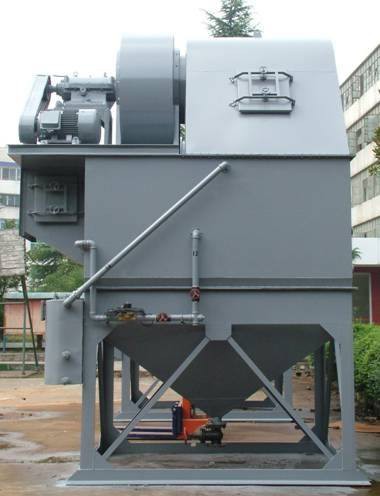 含尘气体由通风机吸入除尘器入口,气流转弯向下冲击于水面,部份较大的尘粒灌入水中。当含尘气体以18~35米/秒的速度通过上、下叶片间的“S”形通道时,激起大量的水花,与水气充分接触,绝大部份微细的尘粒混凝土入水中,使含尘气体得以充分的净化。经由“S”形通道后,由于离心力的作用,获得尘粒的水又回漏斗。净化后的他体由分雾室外挡水板除掉水滴后经净气出口和通风机排出除尘机组,泥浆则由漏斗的排浆阀定期排出。新水则由供水管路补充。机组内的水位由溢流箱控制,当水位高出溢流堰时,水便流进水封并由溢流管排出。抽在溢流箱上的水位自动控制装置能保证水面在3-5毫米的范围内变动,从而保证机组稳定的节约用水。溢流箱上部用通气管与净气分雾室连通,使两者具有相同高度的水面。溢流箱的水是通过插入除尘器下部连通的,以保持溢流箱水面平稳。